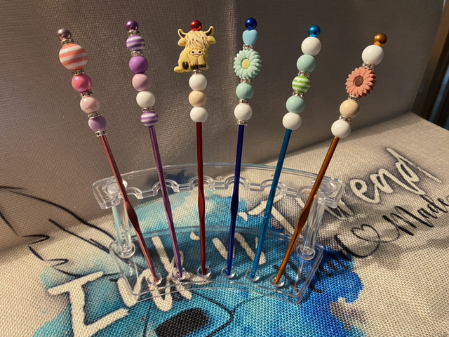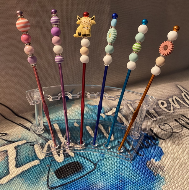 4mm & 6mm crochet hooks which are decorative with beads, spacers and buttons.